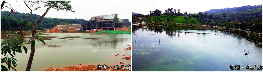 蘭湖屬于原有池塘改造,水域面積16000m2,水深1.2-3m之間,施工后,水體清澈見底,沉水植物生長旺盛,覆蓋率達到75%以上,各項水質指標均達到Ⅲ類水標準。